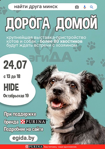 24 июля 2021 года Общественное объединение защиты животных «Эгида» приглашает минчан на благотворительную акцию «Дорога домой!», которая состоится в клубе «HIDE» по адресу ул.Октябрьская 19/4.