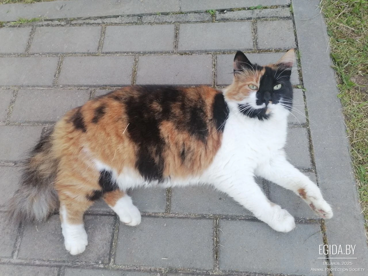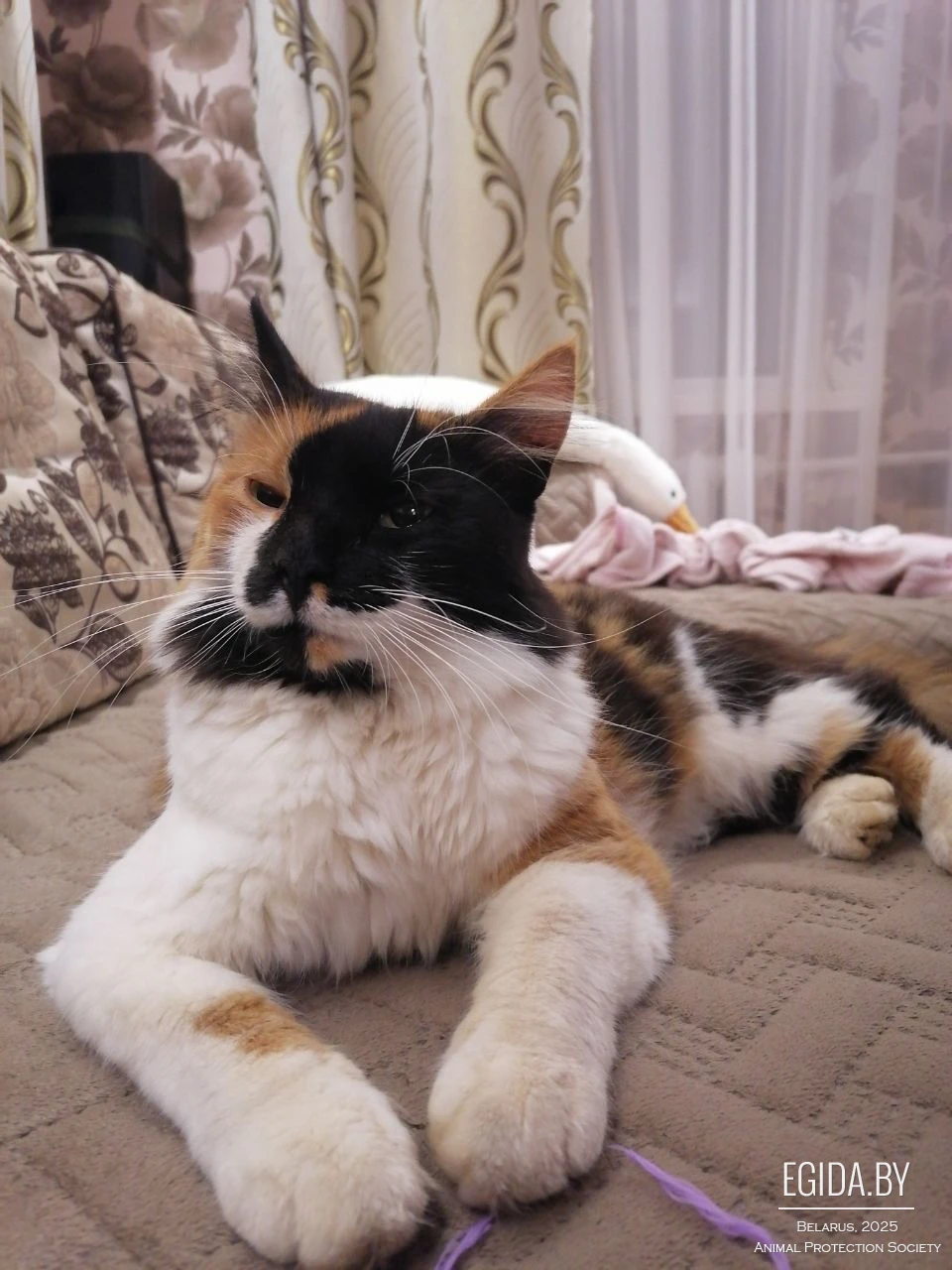 Примечательные черты: большая пушистая кошка, пестрый окрас; одна половинка мордочки черная, а другая рыженькая; ушки тоже разных цветов - одно черное, а другое рыжее; грудка, пузико и передние лапки белые, задние лапки рыженькие с черненьким.