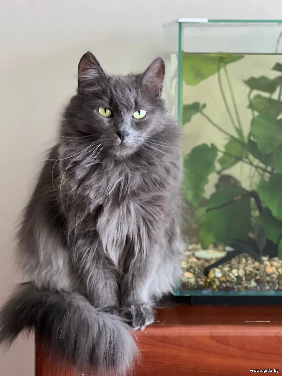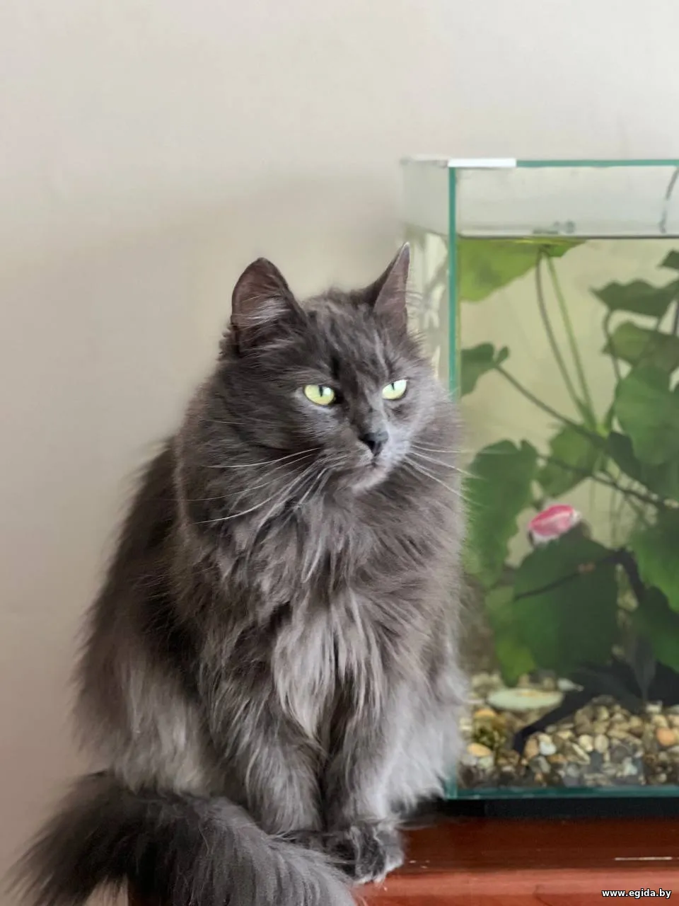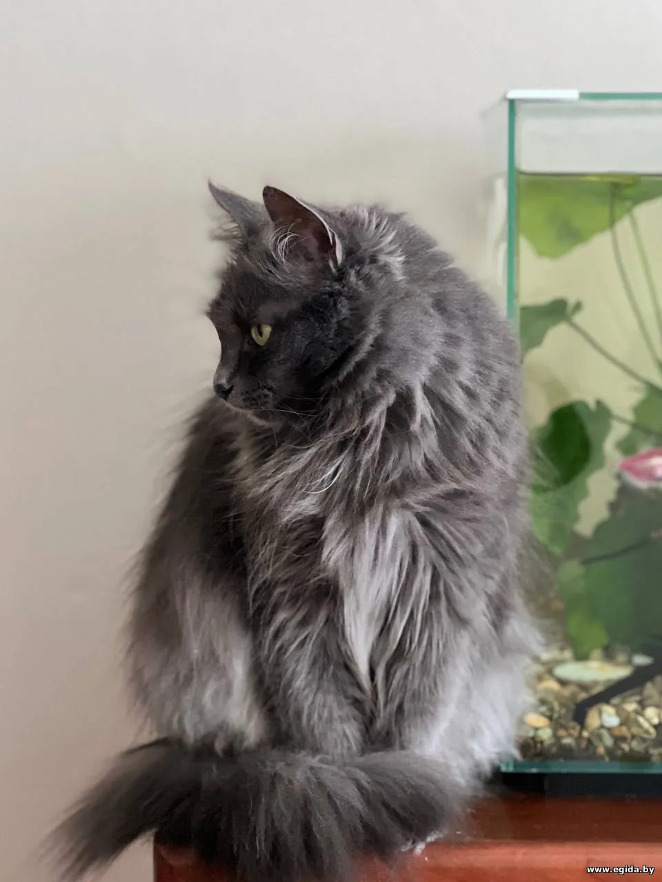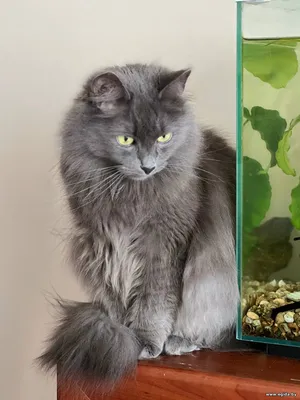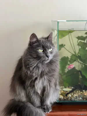 Очень красивая кошечка с густой пушистой шерстью, шикарным хвостом и выразительными глазами (фенотип породы нибелунг). Любит гладиться, мурчать, ждет, когда к ней подойдут, почешут. При этом знает себе цену – если ей что-то не нравится, даст это понять (иногда, может дать лапой, но без когтей).