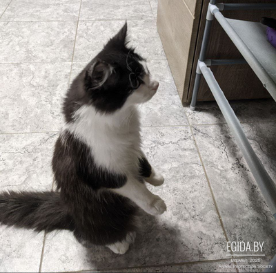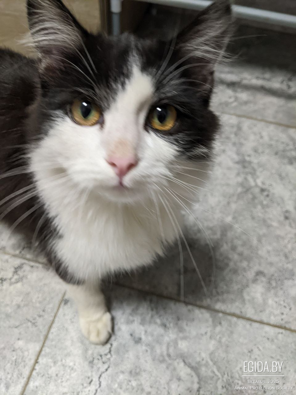 Молодая кошка (9 мес.). Очень ласковая, добрая, игривая, отлично ладит с другими животными, в т.ч. с собакой. Не стерилизована, к лотку приучена. Окрас чёрно-белый, в меру пушистая.