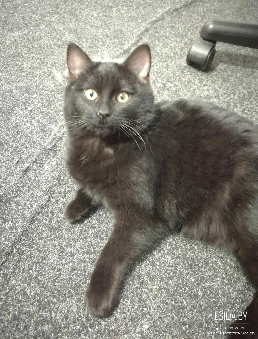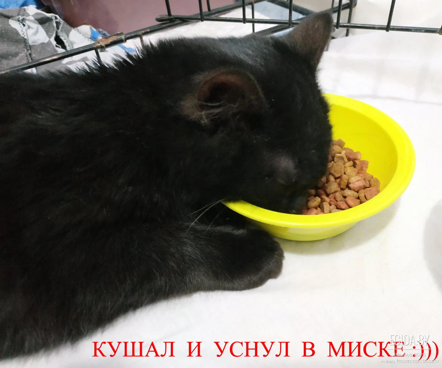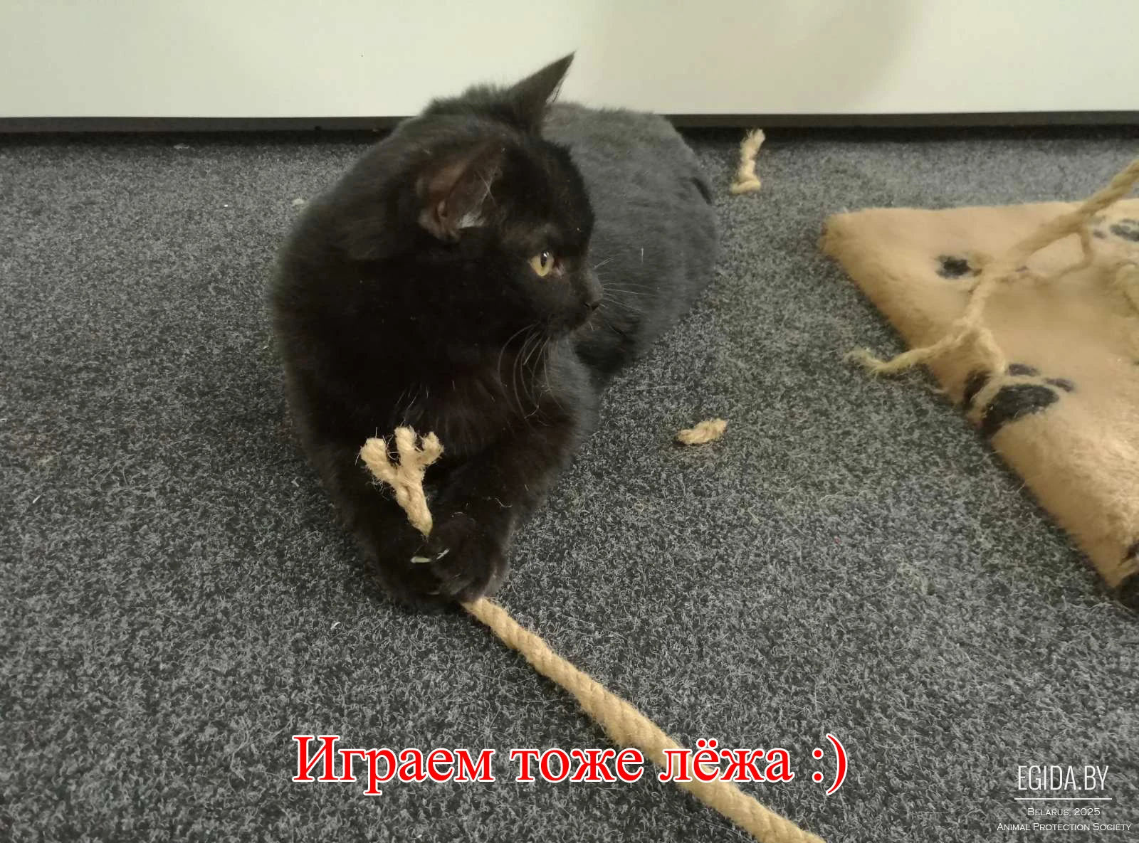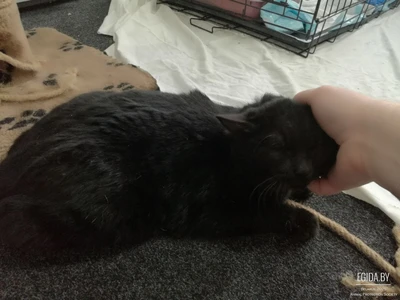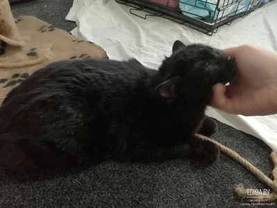 Идеальный вариант для пожилого человека либо для того, кто хочет себе ласкового, ручного, ленивого и несколько неуклюжего котёнка. Он готов, чтобы его не переставая чесали в любых местах. При малейшем прикосновении превращается в «вату». Просто черненький пушистенький тюфячок. Шерсть черная, блестящая, со светлым подшерстком, на ощупь очень приятная, как пух, но при этом котик практически не линяет. Никогда не мяукает, только крайне редко муркает и постоянно урчит от удовольствия прикосновения человеческой руки. Несколько неуклюжий и очень смешной. Играть любит, но преимущественно лёжа с каким-нибудь шнурком или игрушкой, и не более одной минуты. Может кушать из миски сидя, потом ложится, а потом и засыпает с головой на краю миски вместо подушки. Котик ждет своего человека, с которым можно будет спать вместе по ночам, а днем лениво сидеть на руках и смотреть телевизор. Котенку около 5 месяцев, но он очень крупный для своего возраста (именно крупный, а не толстый). Приучен к лоточку, кастрирован, привит, кушает абсолютно всё, НЕ дерёт обои и остальную мебель (он просто этого даже не знает), точит когти только о когтеточку.
