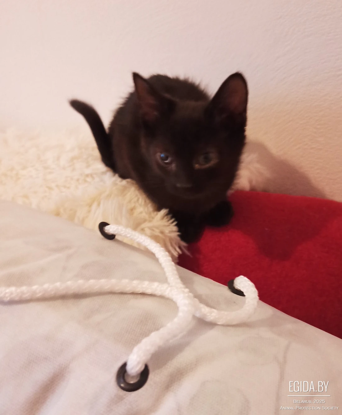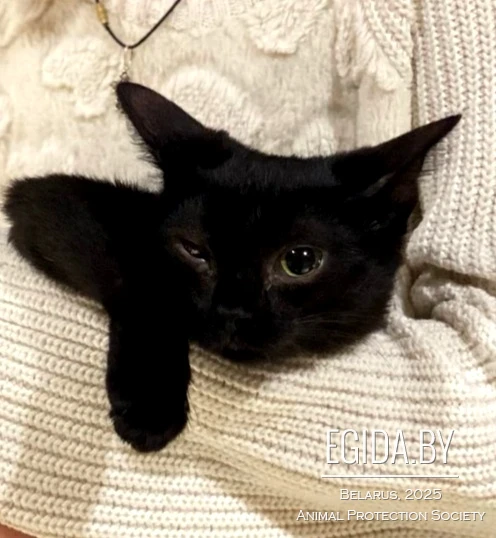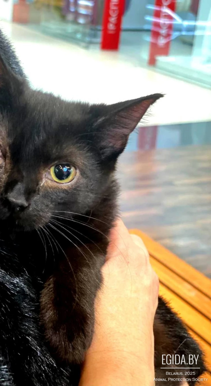 Маленькая крошка 4м-ца, подобранная малюткой с началом морозом с улицы, увы с больными уже глазиками, один в результате лечения полностью восстановился, а второй так и останется с дефектом.