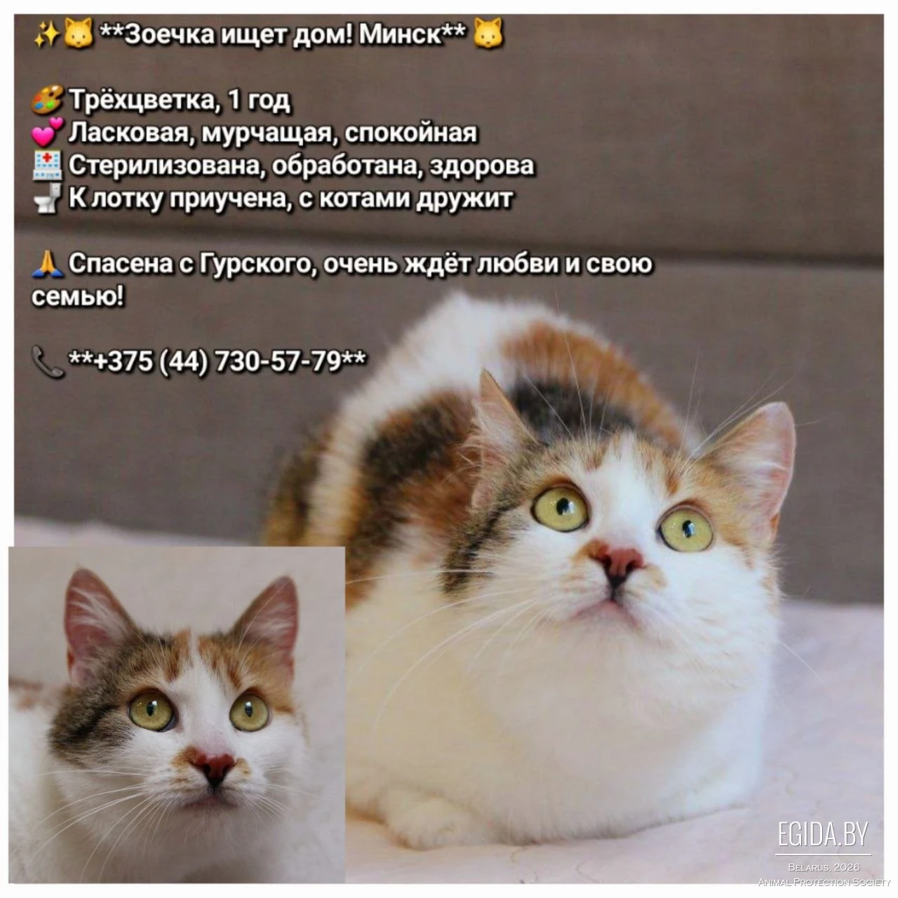 Пристраивается в самые добрые ручки очаровательная трёхцветная красавица Зоечка . Девочке один годик, недавно стерилизована, обработана от паразитов, приучена к лотку, отлично ладит с другими котами. Кошка очень ласковая, спокойная, мурчащая, очень нуждается в любви и ласке человека. Малышку спасли с Гурского. Сейчас она здоровая на передержке с большим количеством животных, и ей очень не хватает внимания и почесушек.