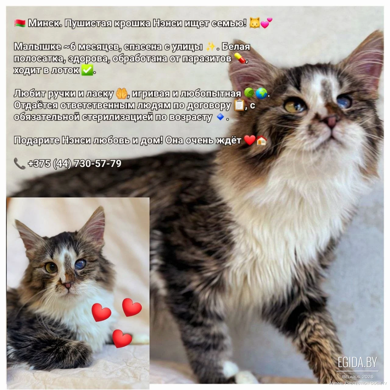 Возраст примерно 6 месяцев, была спасена с холодной улицы. По окрасу белая и полосатая. Нэнси здорова, обработана от паразитов, ходит в лоток. Расслабляется на ручках, любит, когда её гладят, играет и изучает окружающий мир).