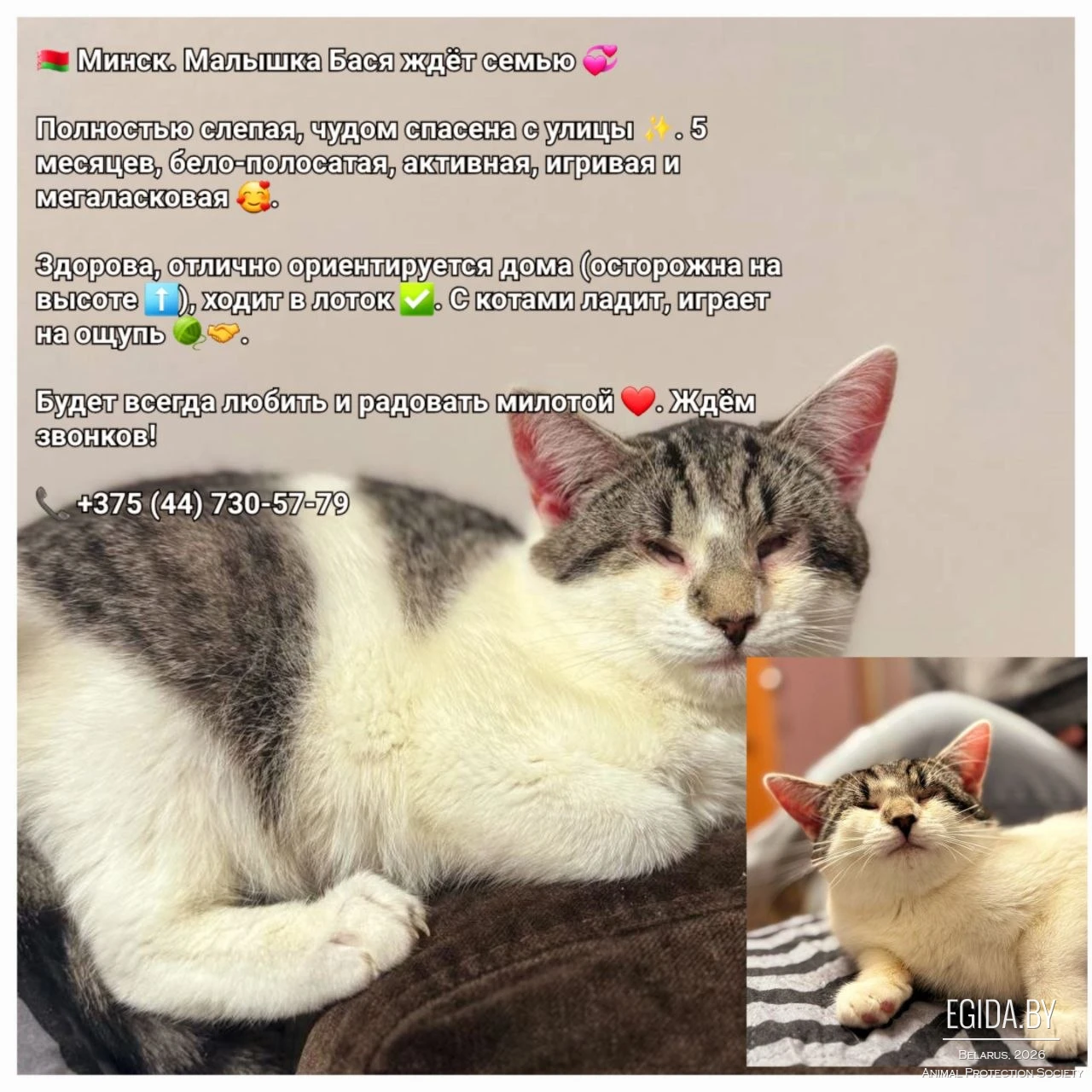 Басенька очень активная, игривая, мегаласковая и нежная зайка бело-полосатого окраса .