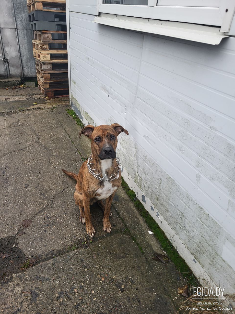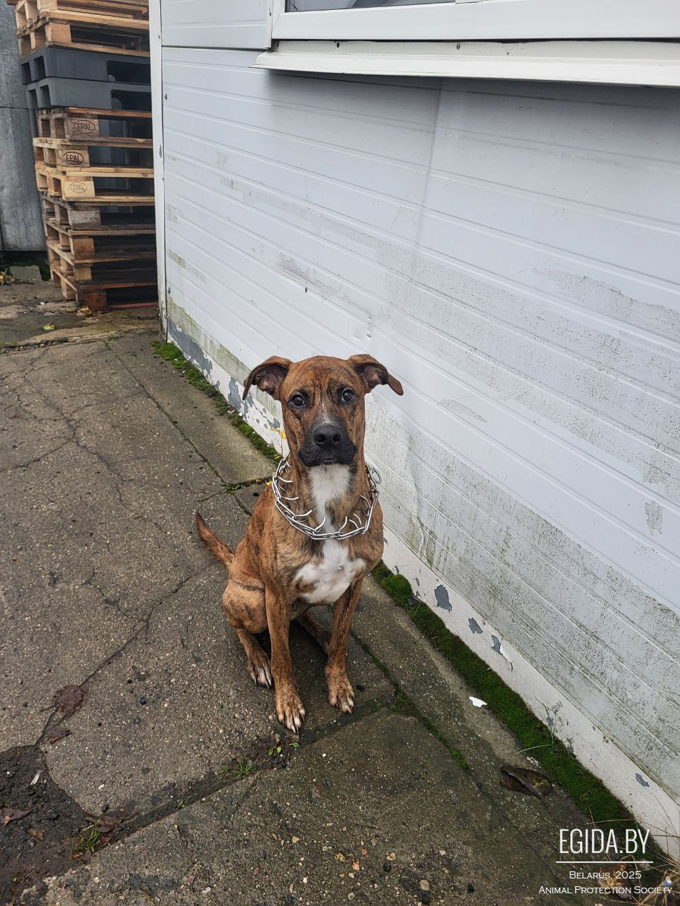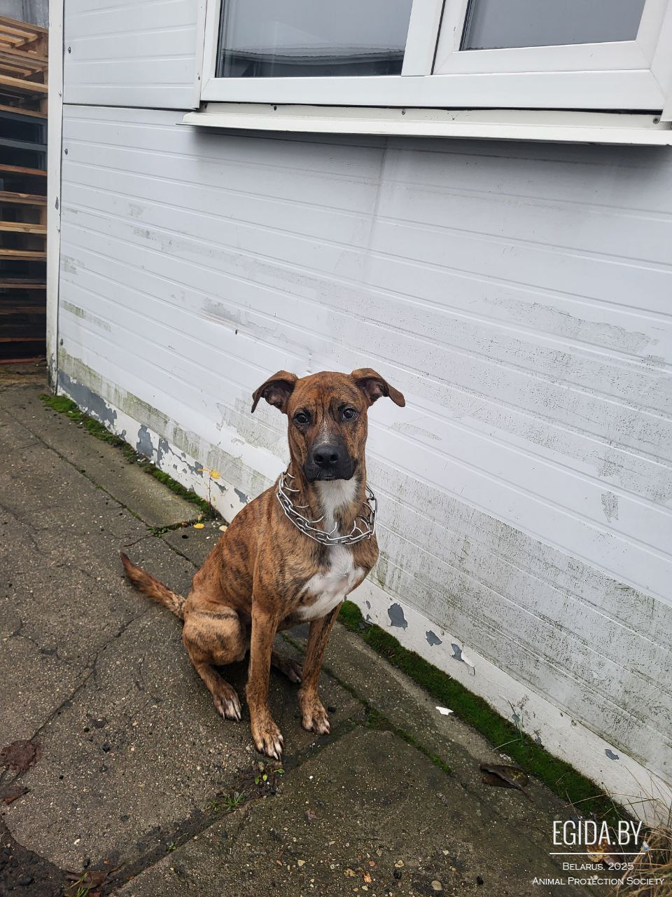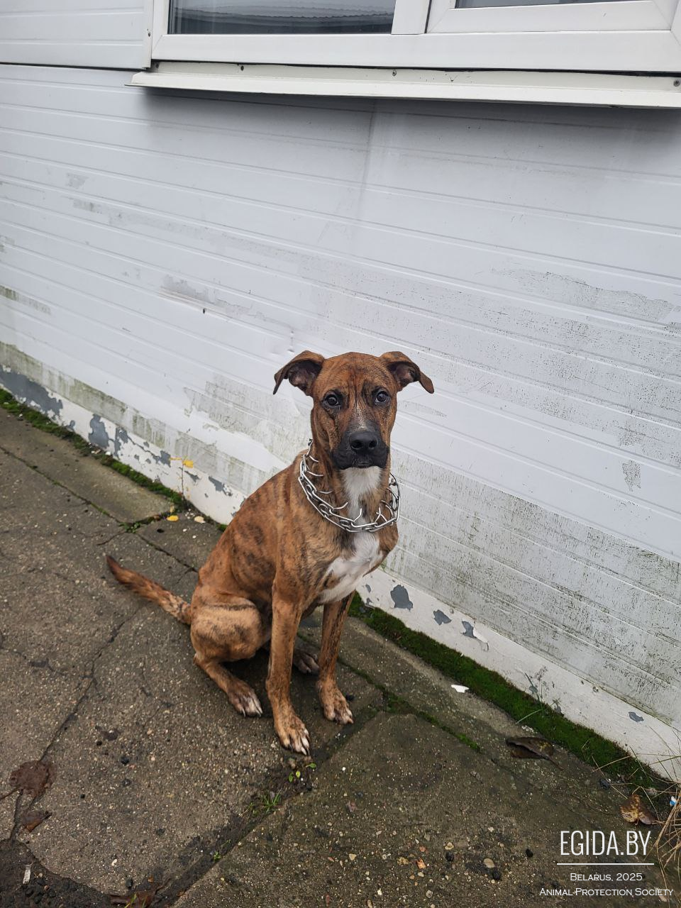Боксерская собака, тигрового окраса. Глаза добрые, послушная, откликается на команды. На шее большая цепь. Очень боязливая.