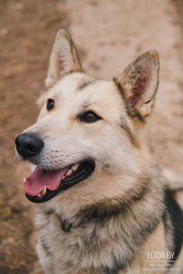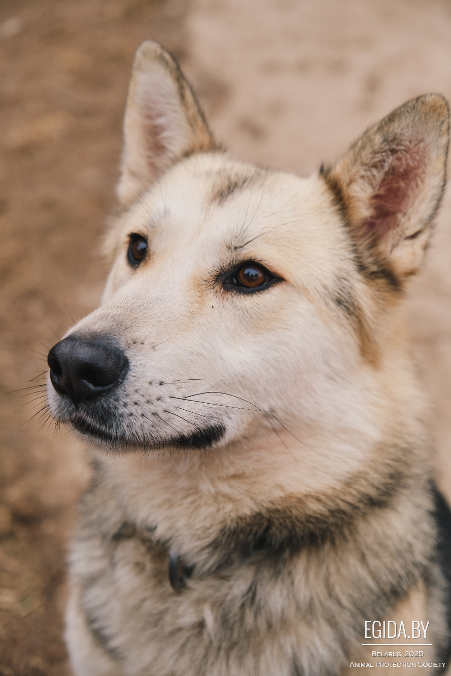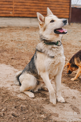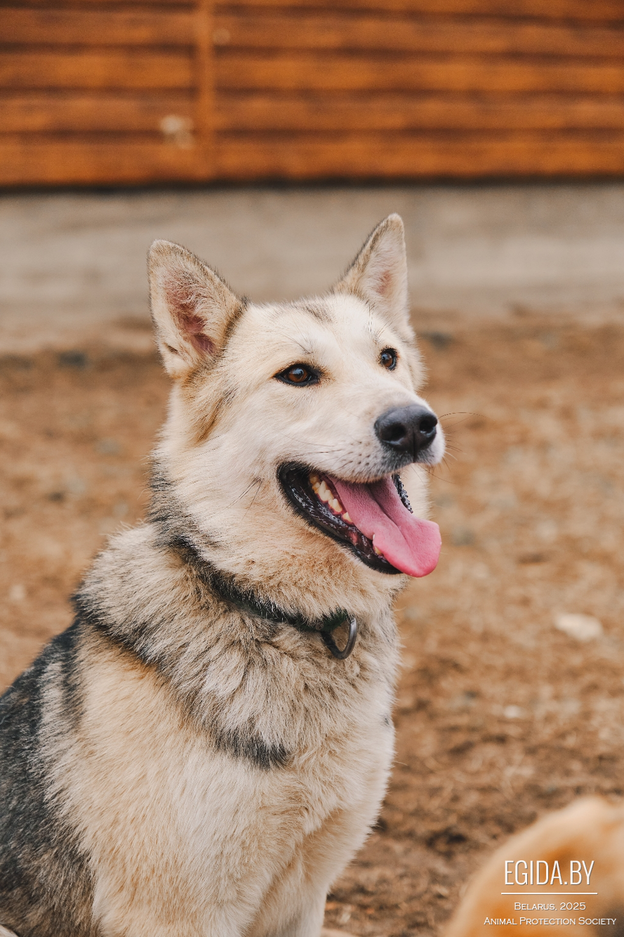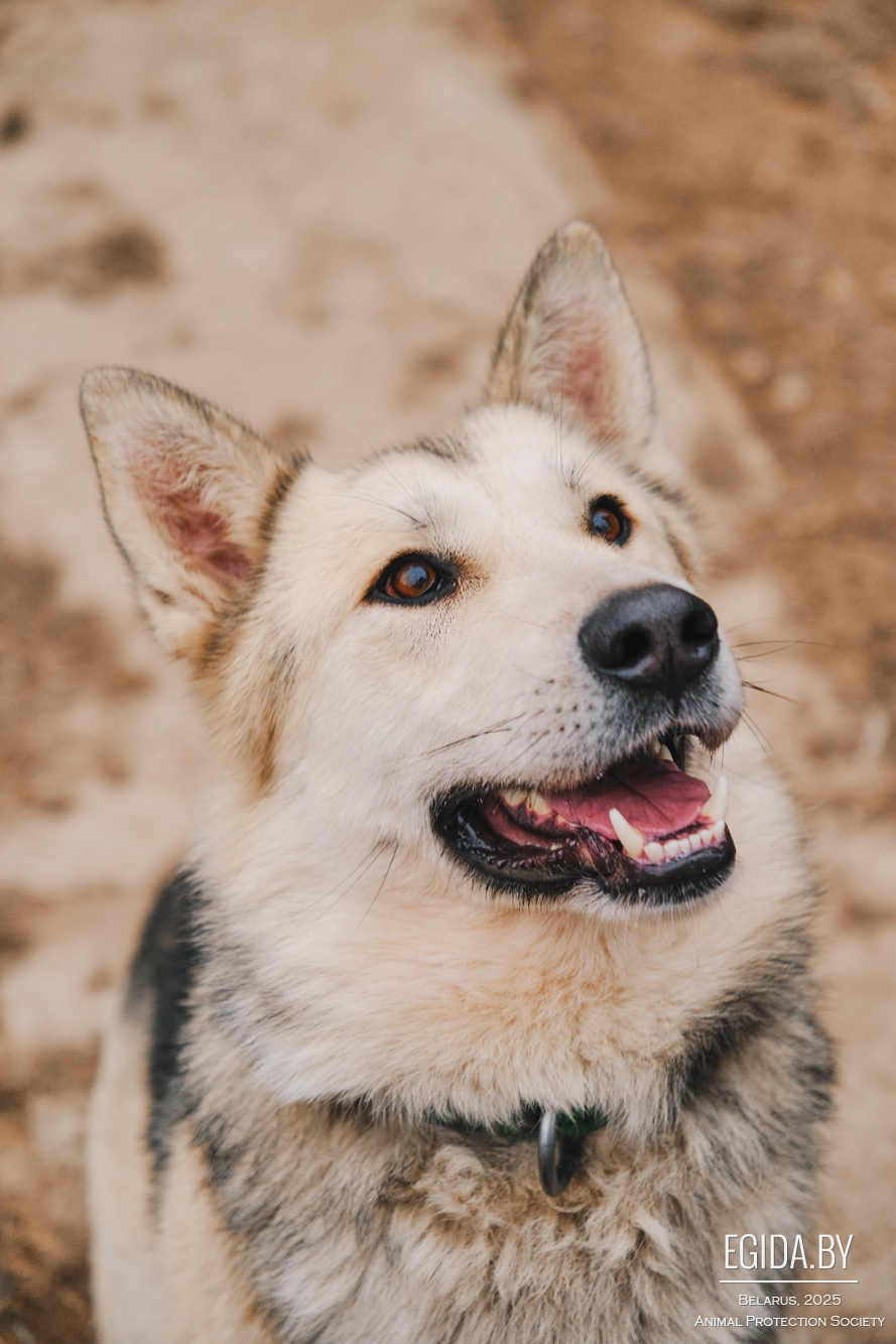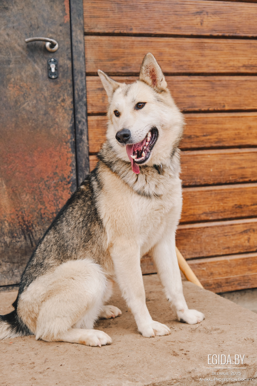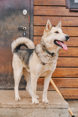 Вероятно, метис лайки. Около 3,5 лет. Здоров, обработан, вакцинирован. Мощный и активный. Показывает хорошие способности к изучению команд. Терпит двухразовый выгул.