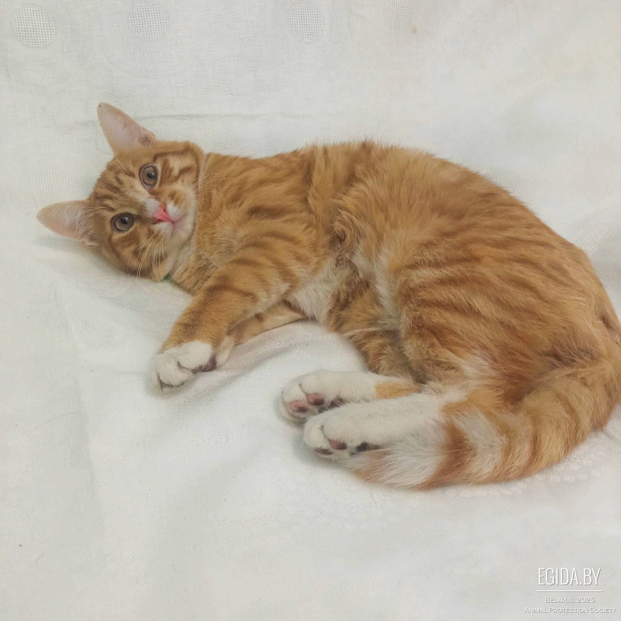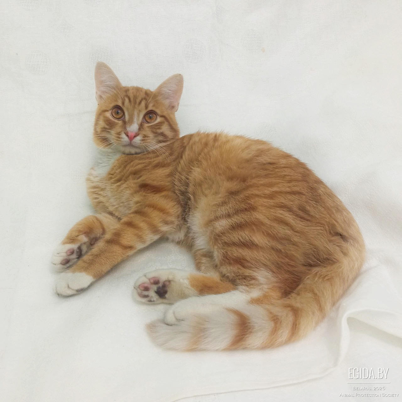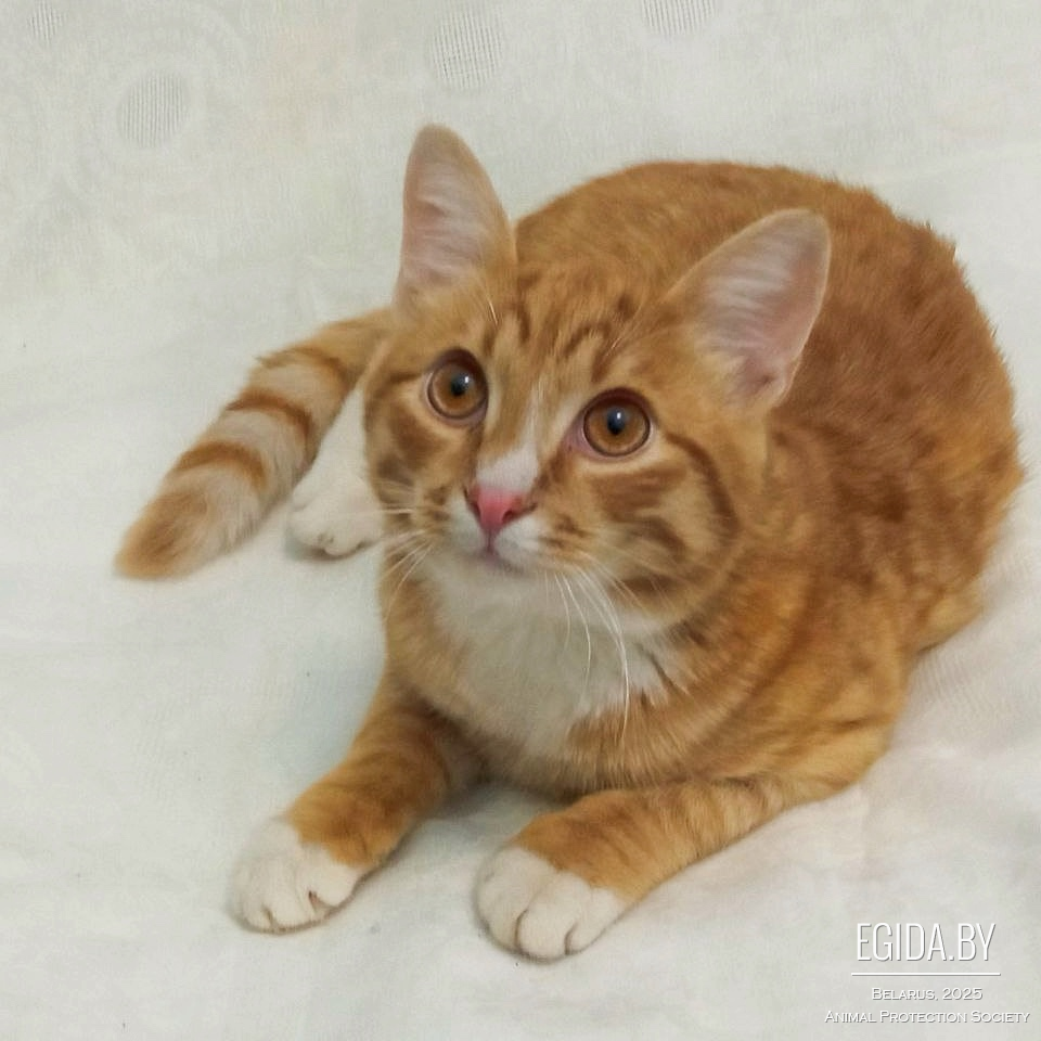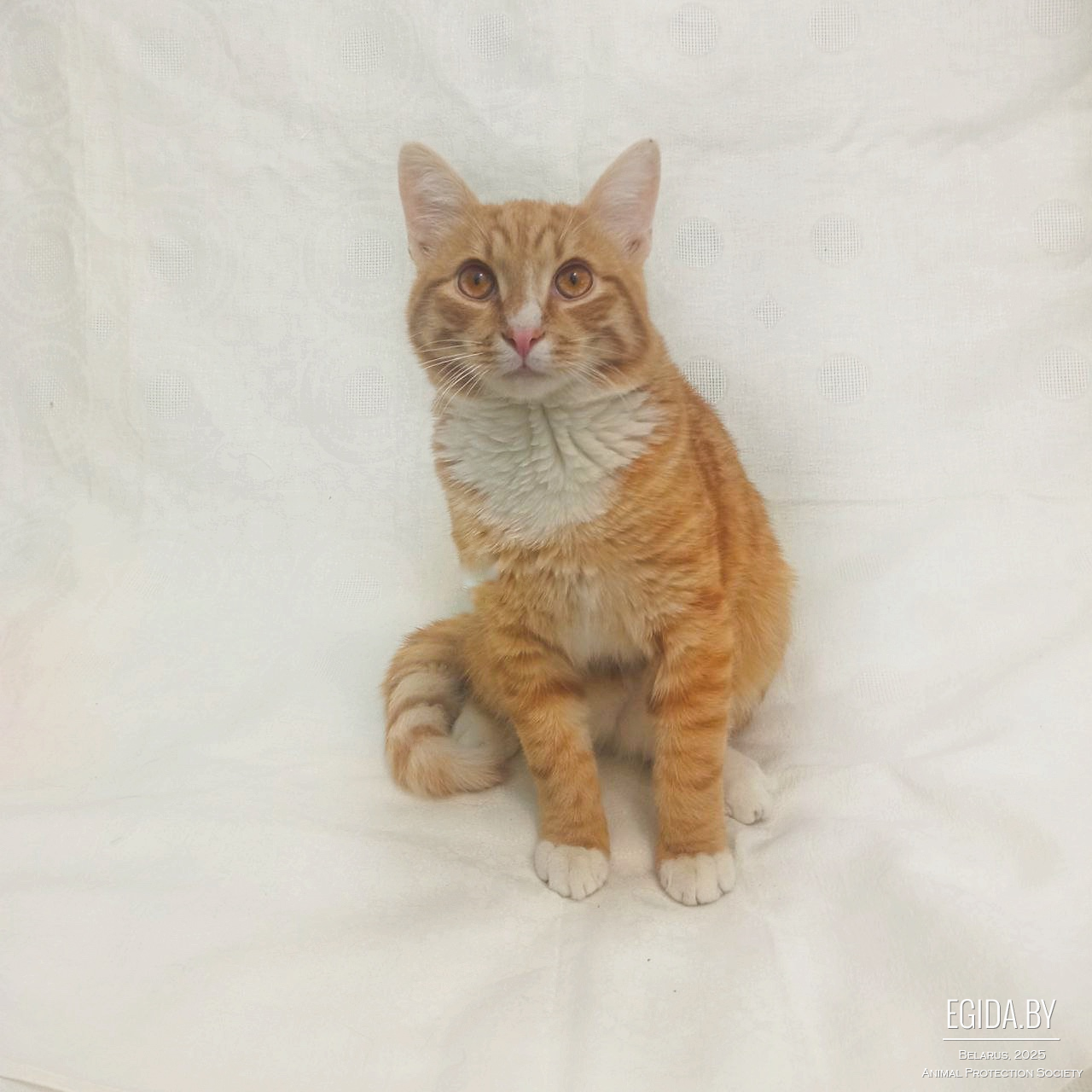 Персик, 7 месяцев, мальчик солнечного рыжего окраса с белыми носочками, грудкой и розовым носиком. Очень обаятельный малыш.