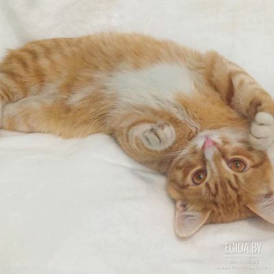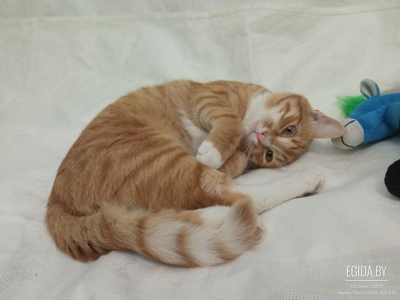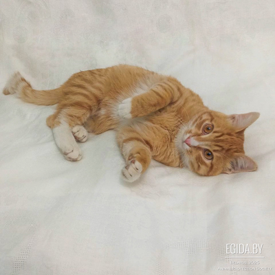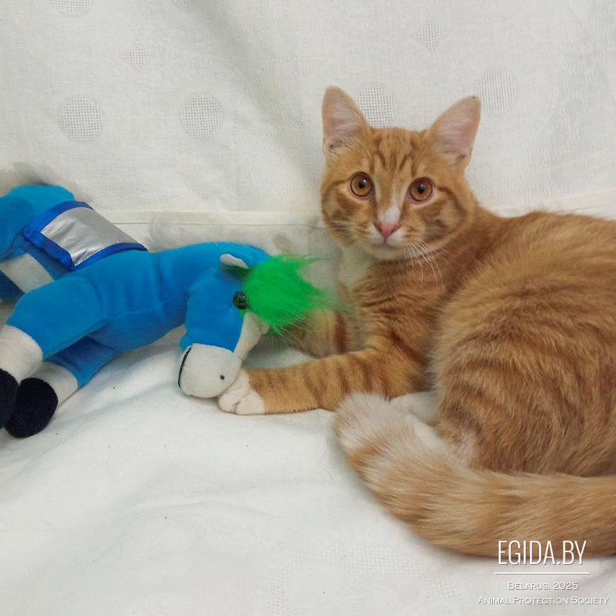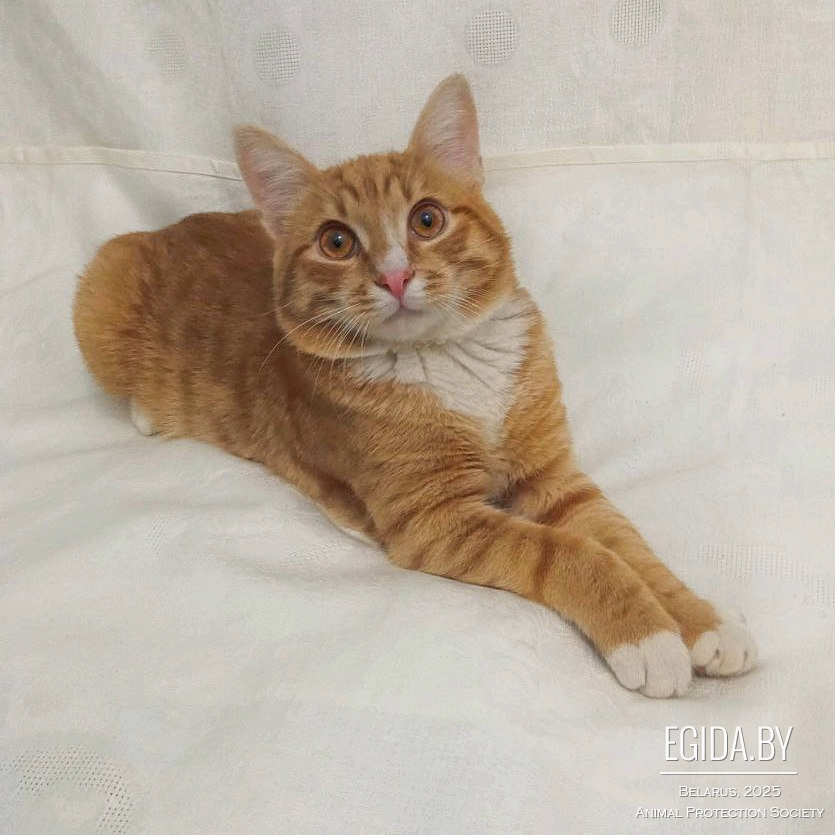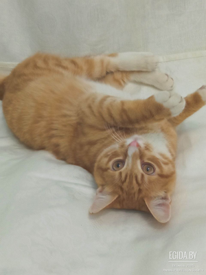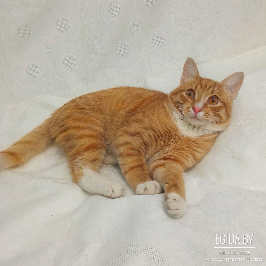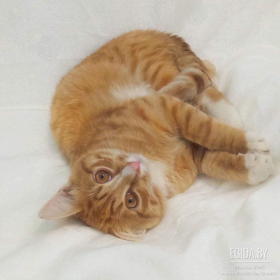 Персик, 7 месяцев, мальчик солнечного рыжего окраса с белыми носочками, грудкой и розовым носиком. Очень обаятельный малыш.