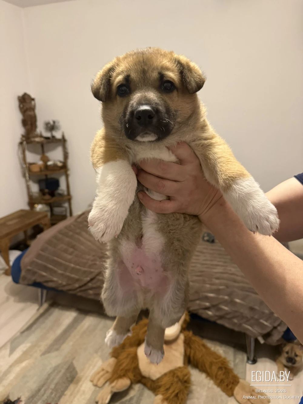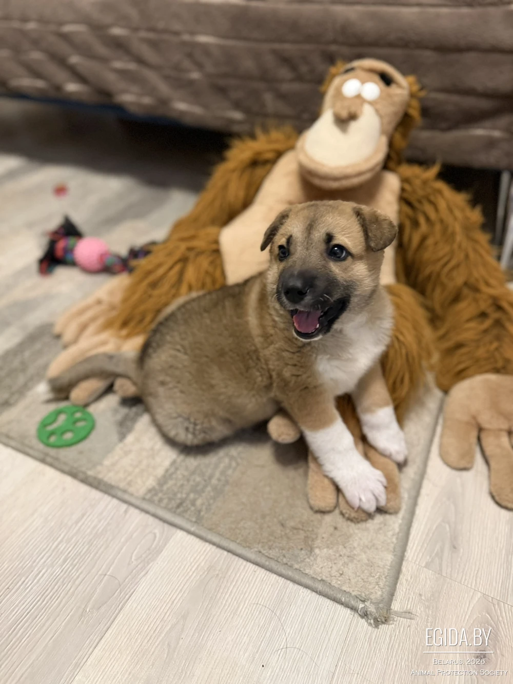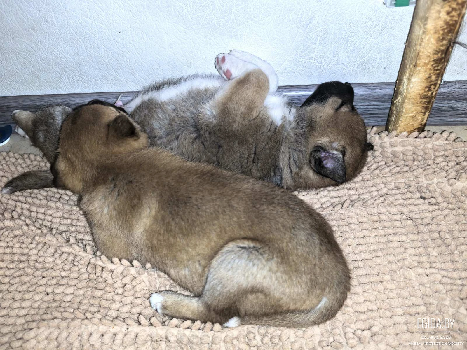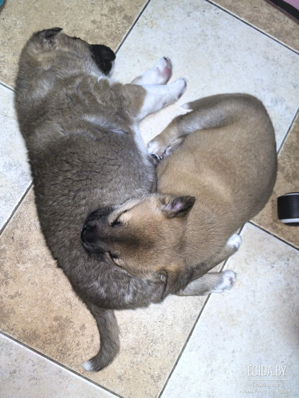 Премудростям собачьим учится у взрослой собаки, которая их приняла как детей.
