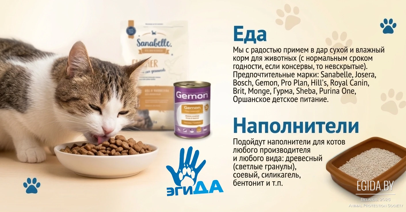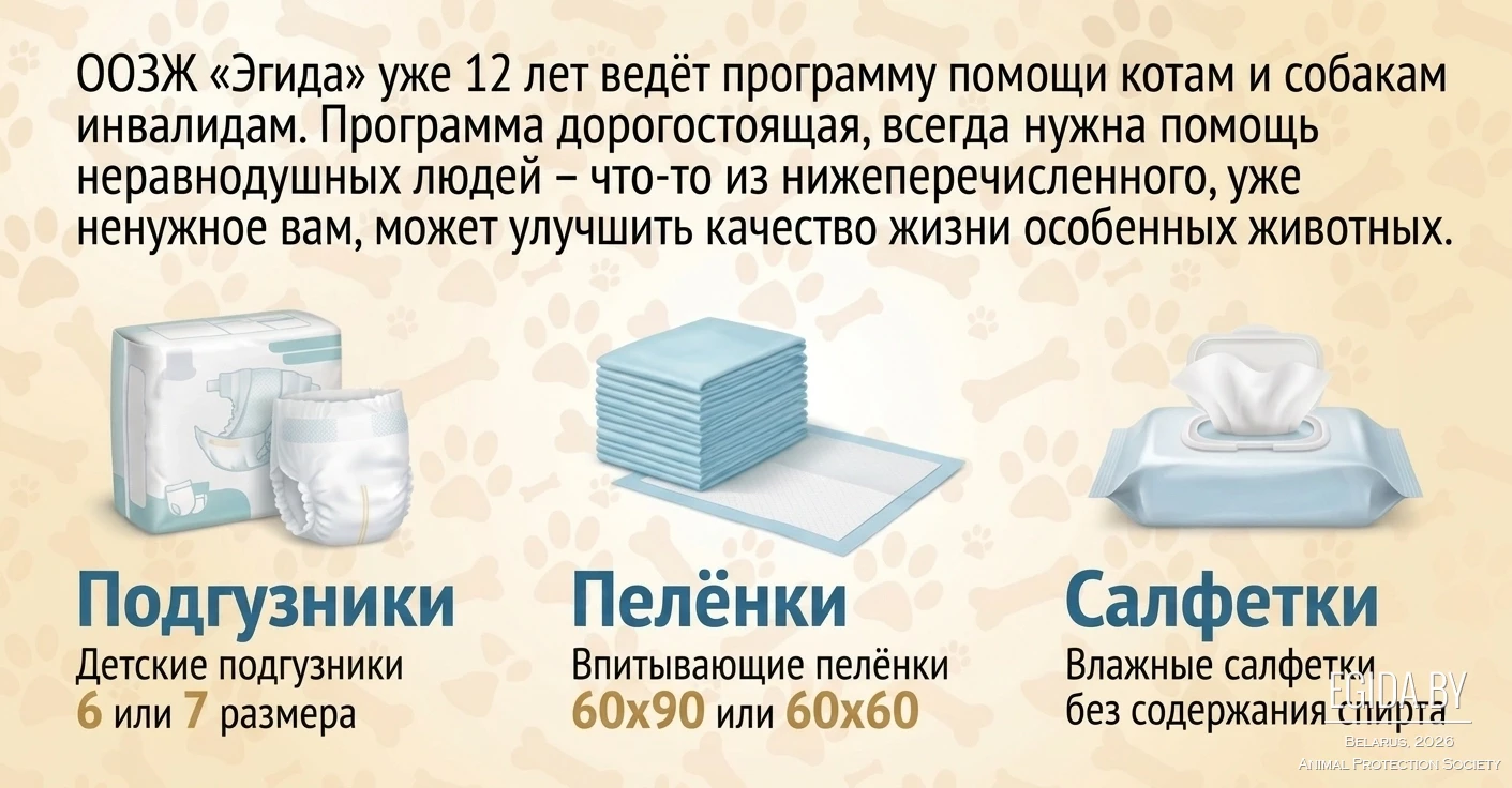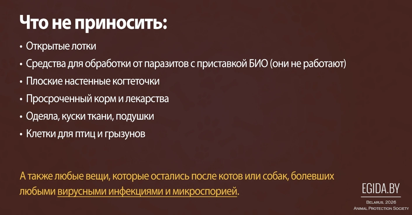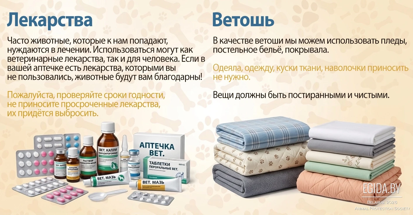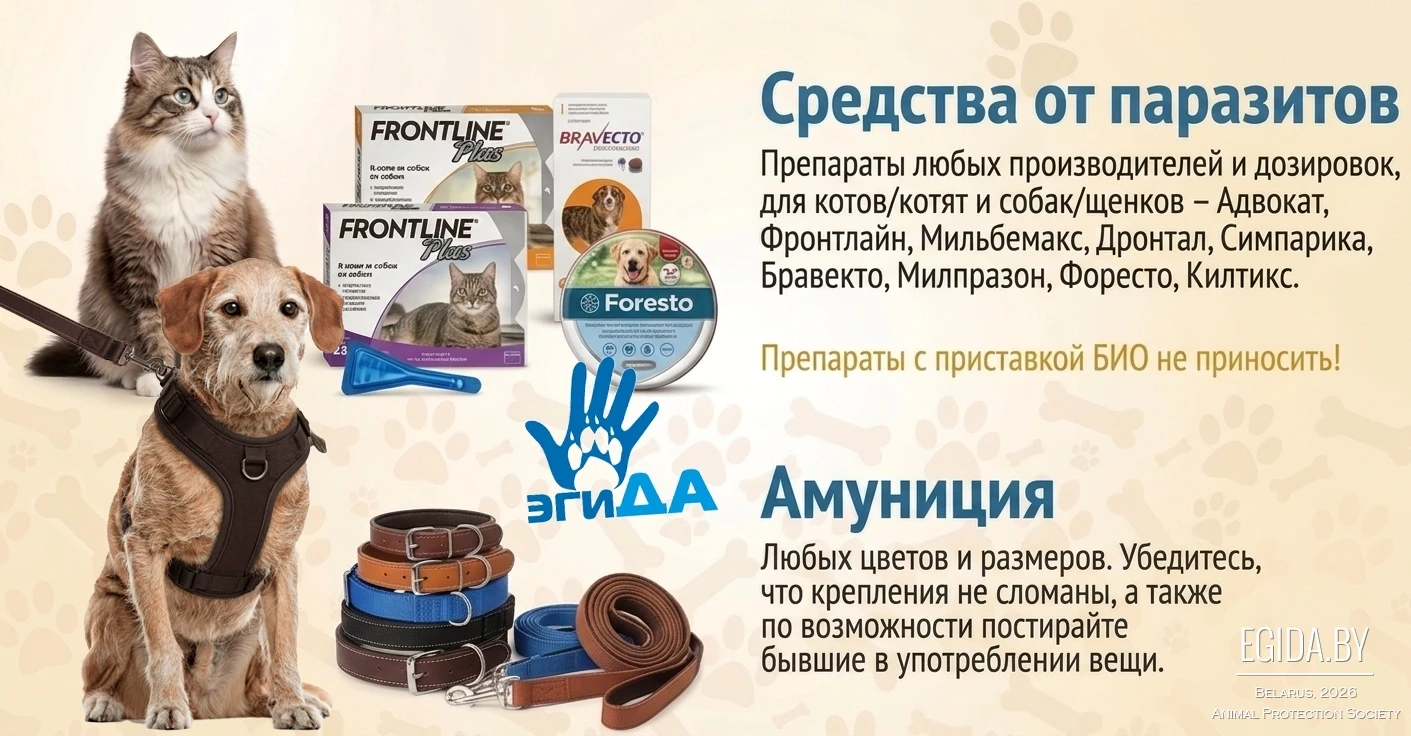 Кроме того, в рамках акции будет организован сбор помощи для подопечных ООЗЖ «Эгида». Можно принести корма, амуницию, пелёнки, наполнители, медикаменты и другие нужные вещи — всё то, что ежедневно необходимо спасённым животным.