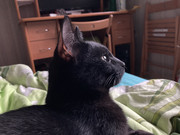 Тимоша - черныш, возраст примерно 5 месяцев. Кастрировала его по дороге на другую передержку, потому что начал проявлять мужские замашки.