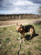 Фидэль из отлова. На нем был очень старый деревенский ошейник, по которому девочки имеют мнение, что он был на цепи когда-то: старый , толстый и туго застегнут.
